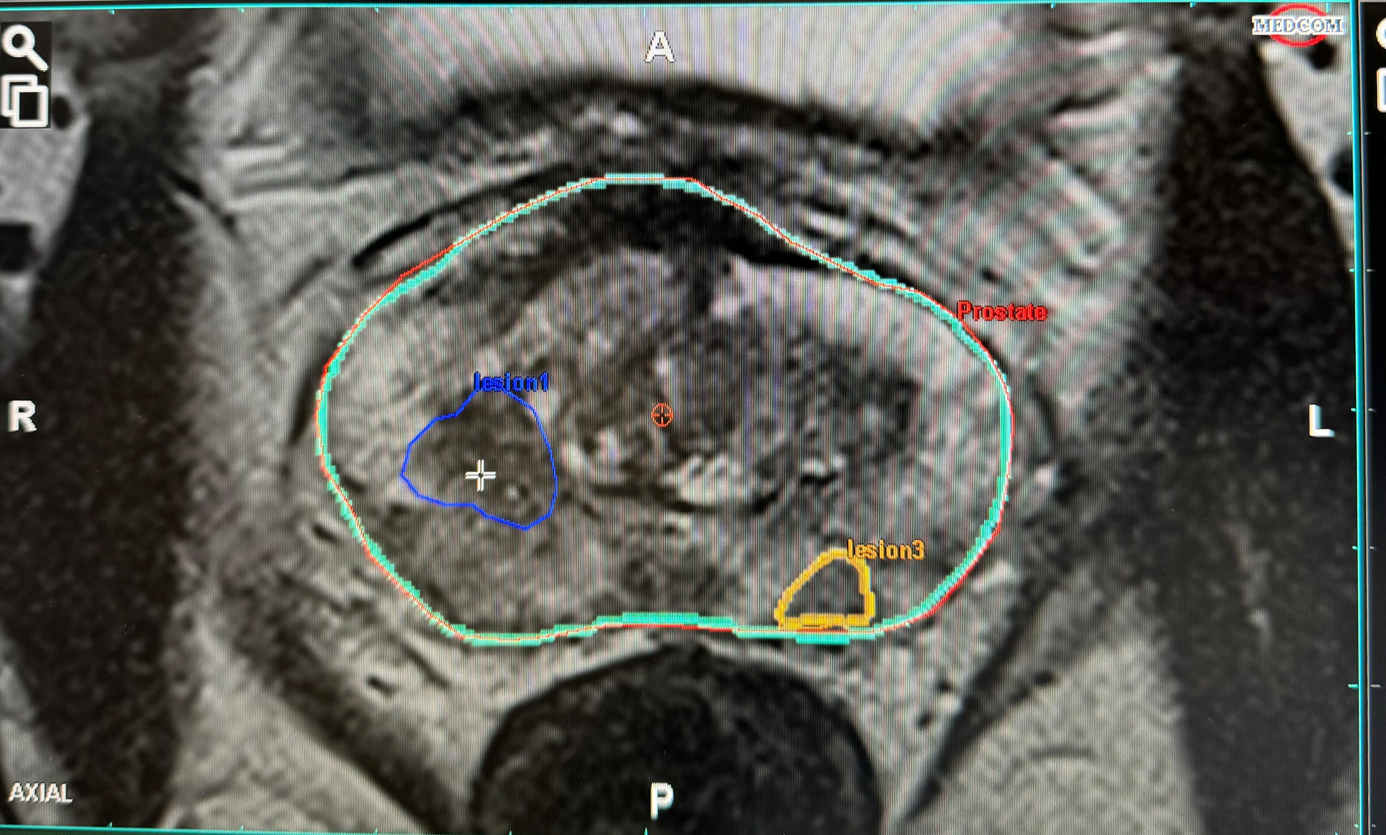 Nach der Anfertigung Ihres mpMRTs der Prostata lesen wir die gewonnenen Bilder in eine KI-gesteuerte Planungssoftware ein. Hierbei fokussieren wir uns auf die korrekte Kontur Ihrer Prostata, Ihrer Harnröhre und dem Areal, welches von Ihrem Radiologen, als auch von künstlicher Intelligenz als auffällig beschrieben wurde. Diese angefertigte Kontur wird dann in das Ultraschallgerät vor Ihrer Biopsie übertragen. Mit Hilfe dieser Konturen sind wir in der Lage, auch kleinste auffällige Areale gezielt zu biopsieren.