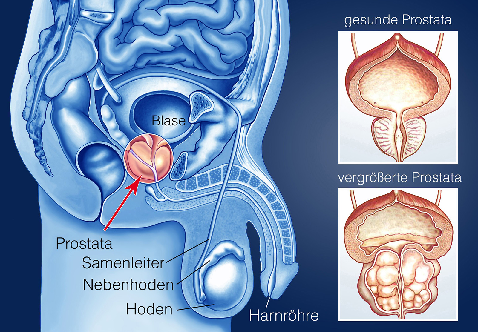 Die Prostata (Vorsteherdrüse) gehört wie die Hoden zu den Geschlechtsorganen des Mannes. Das etwa walnussgroße Organ sitzt direkt unter der Blase und umschließt an dieser Stelle ringförmig die ...